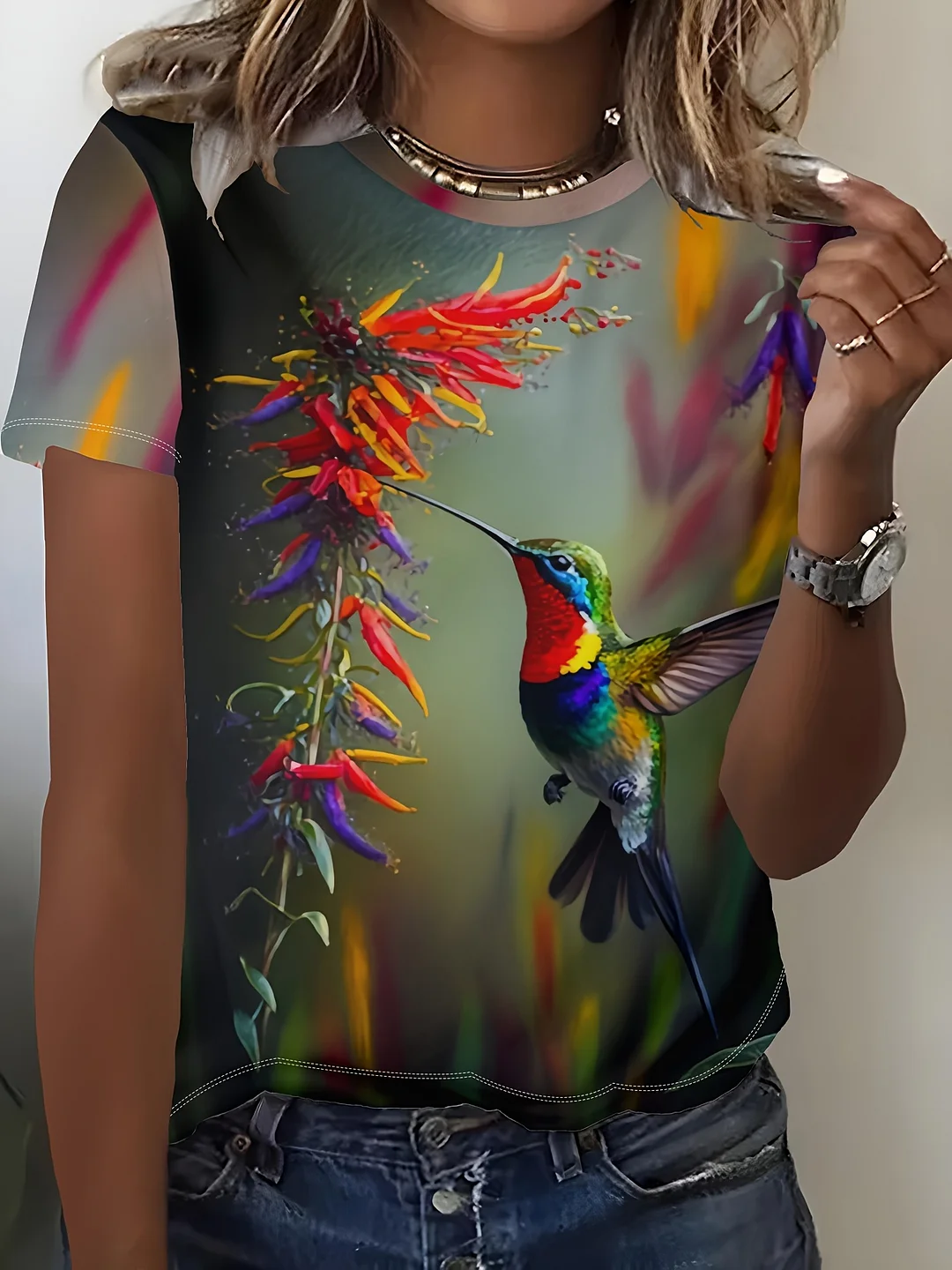 Women's Casual Short Sleeve T-Shirt With Flying Hummingbird & Floral Digital Print - Vibrant Colors, Round Neck, Machine Washable, All-Season Comfort, Ladies T Shirts, Comfortable Clothing, Natureinspired Design, Detailed Artwork